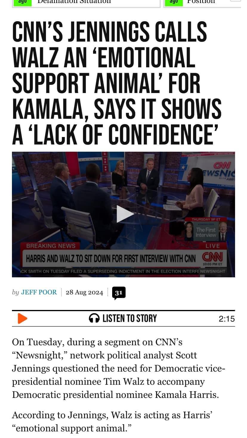 -Chắc hết tiền quảng cáo. Trong chương trình Newsnight của CNN, Chuyên gia chính trị Scott Jennings gọi ứng cử viên phó tổng thống Tim Walz là con ch.ó của Kamala.