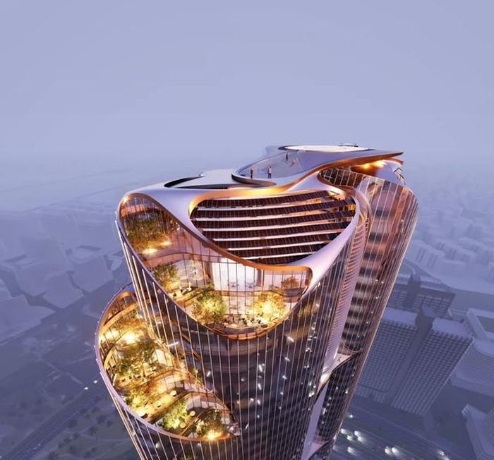 Bản vẽ tòa nhà Forbes International, được thiết lập cho Thủ đô hành chính mới của Ai Cập bên ngoài Cairo. Tòa nhà chọc trời do Gordon Gill của Adrian Smith + Gordon Gill Architecture thiết kế, có khả năng sẽ được cung cấp năng lượng bằng hydro. Ảnh: Courtesy Magnom Properties/AS+GG