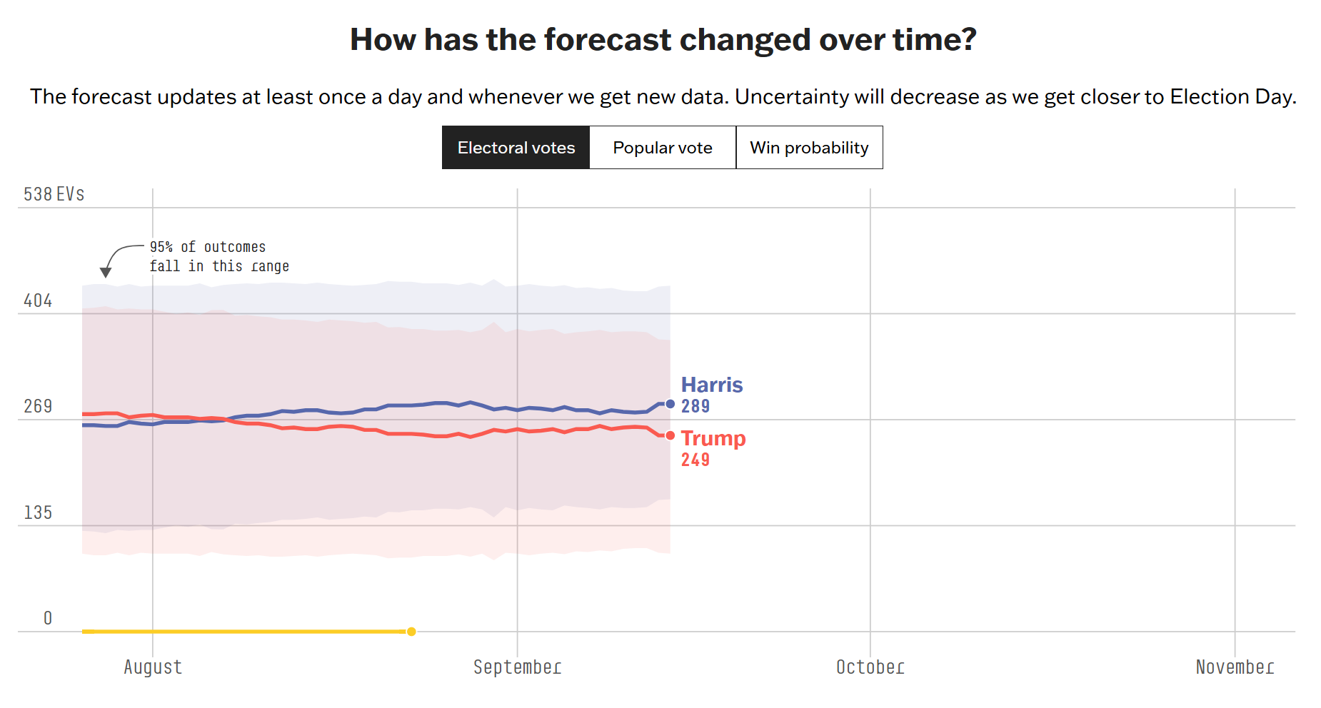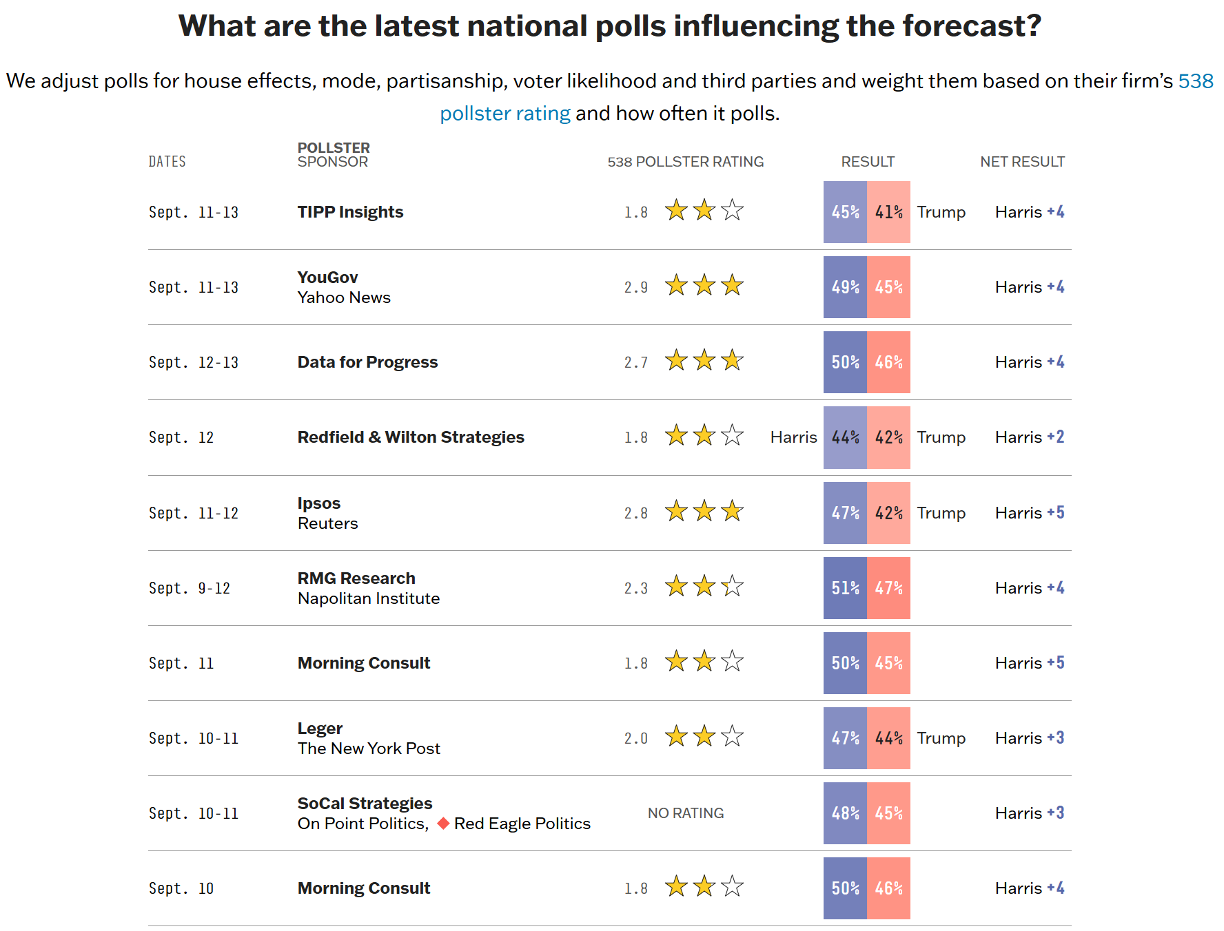 Dự đoán từ trang tổng hợp các tham khảo tính nhiệm trên toàn quốc, trang 538 cập nhật điểm tham khảo hàng tuần cho đến ngày bầu cử (UPDATED Sep. 14, 2024, at 3:14 PM):