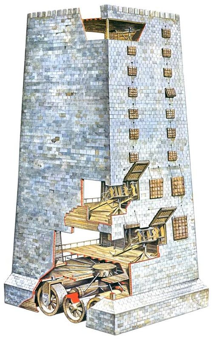 Với trọng lượng khoảng 160 tấn, tháp công thành Helepolis cần tới hàng trăm người di chuyển nó tới vị trí công thành.