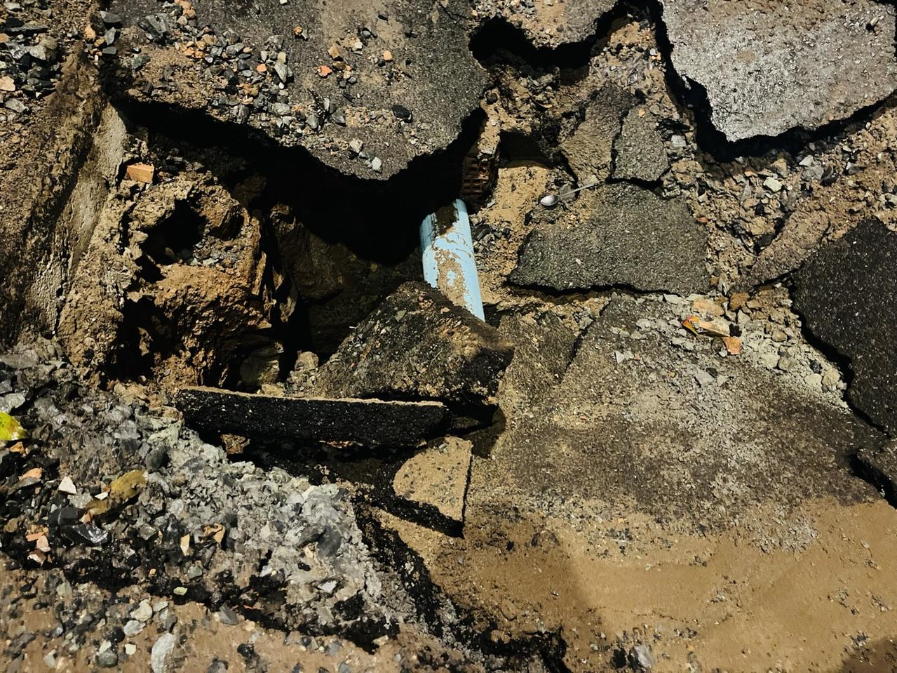 Điểm sụt lún có đường kính khoảng 2m, sâu khoảng 1,5m; có thể nhìn thấy đường ống nước, đất đá ngổn ngang bên dưới.