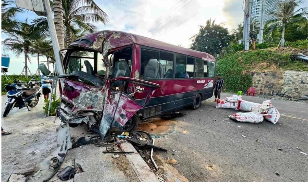 Vụ va chạm khiến ô tô 29 chỗ lao vào vách tường của resort bên cạnh đường, rồi lao qua lề đường bên phía biển, tông vào cột đèn đường mới dừng lại. Tại hiện trường, phần đầu ô tô 29 chỗ bể nát và ô tô con hư hỏng nặng, tài xế ô tô khách bị thương nặng.