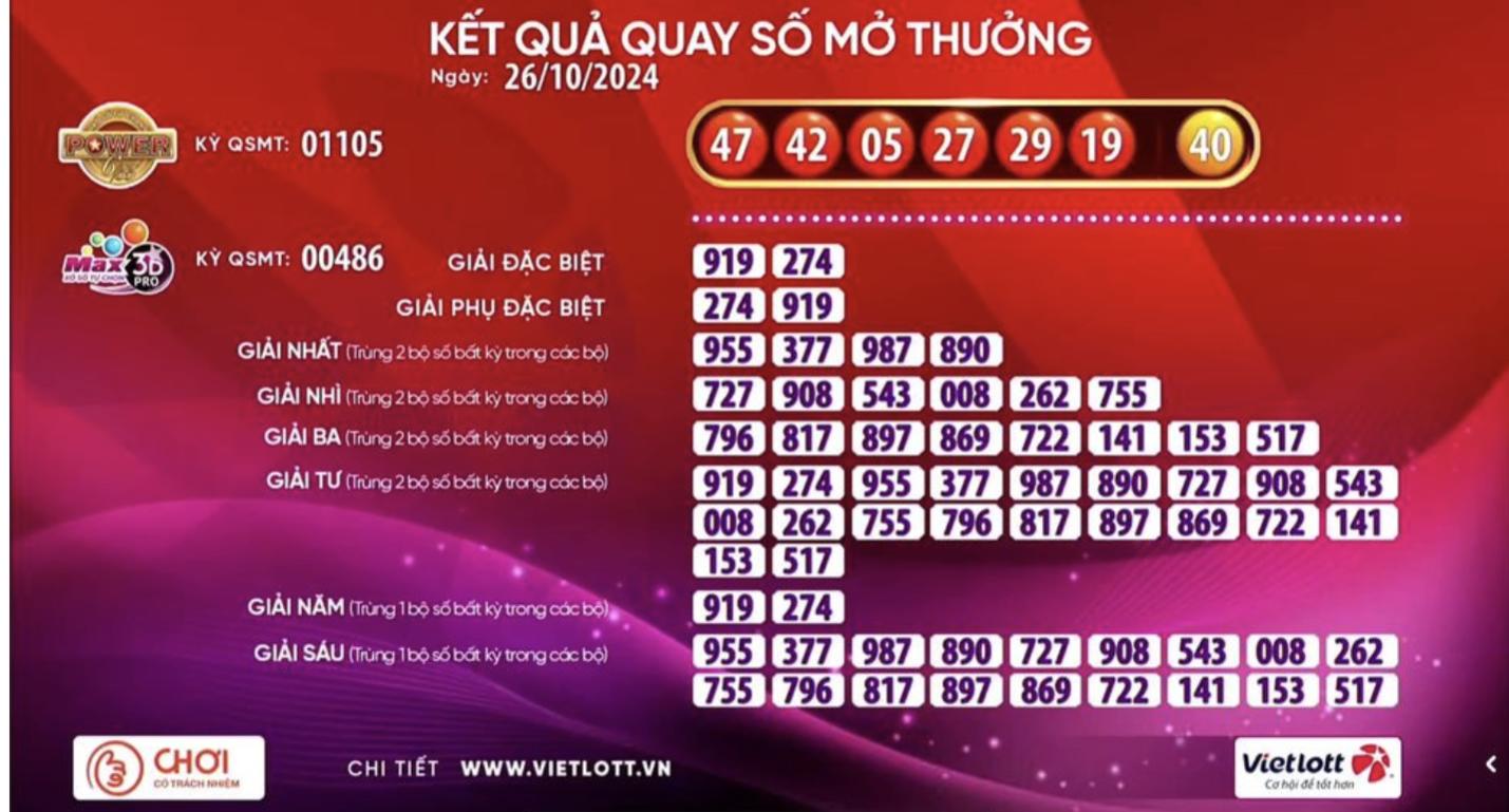Tờ vé số may mắn trúng giải Jackpot 1 có 6 cặp số 47-42-05-27-29-19 trùng với 6 cặp số là kết quả giải Jackpot 1. Vé này được phát hành tại điểm bán hàng trực tiếp của Vietlott.