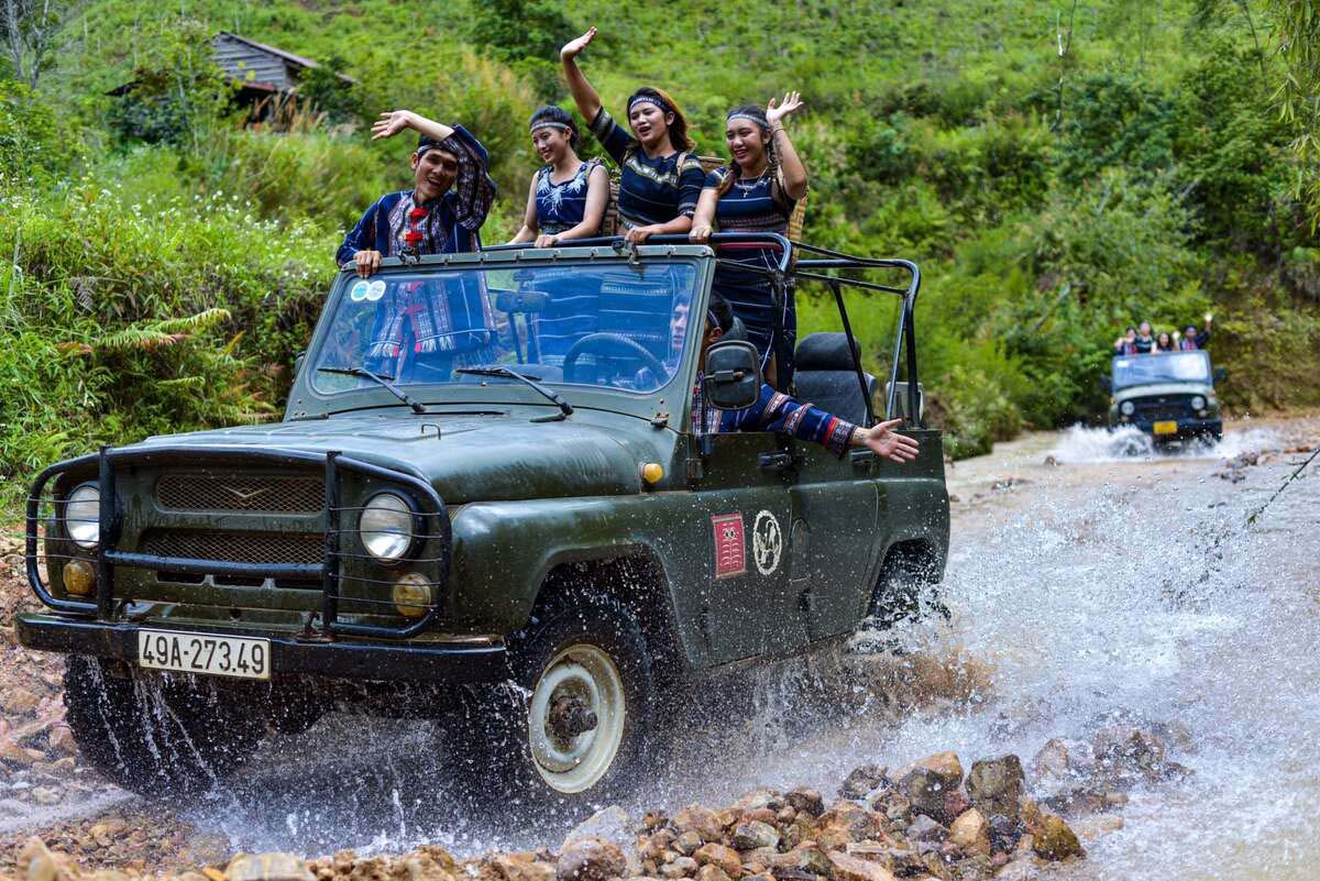 Để đến được làng Cù Lần, một trong những trải nghiệm độc đáo nhất là đi xe jeep vượt suối. Chuyến đi này sẽ đưa du khách qua những con suối và đường rừng, mang lại cảm giác mạo hiểm nhưng cũng rất thú vị. (Ảnh: Vinpearl)