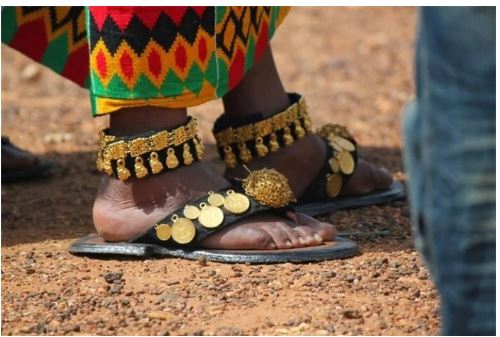 Theo Ethnic Jewels Magazine, những người Ashanti có địa vị cao sử dụng rất nhiều vàng để làm đồ trang sức như vòng tay, vòng chân, nhẫn, chuỗi hạt, mũ, tẩu thuốc, vũ khí, đồ làm lễ hay cả... dép sandal.