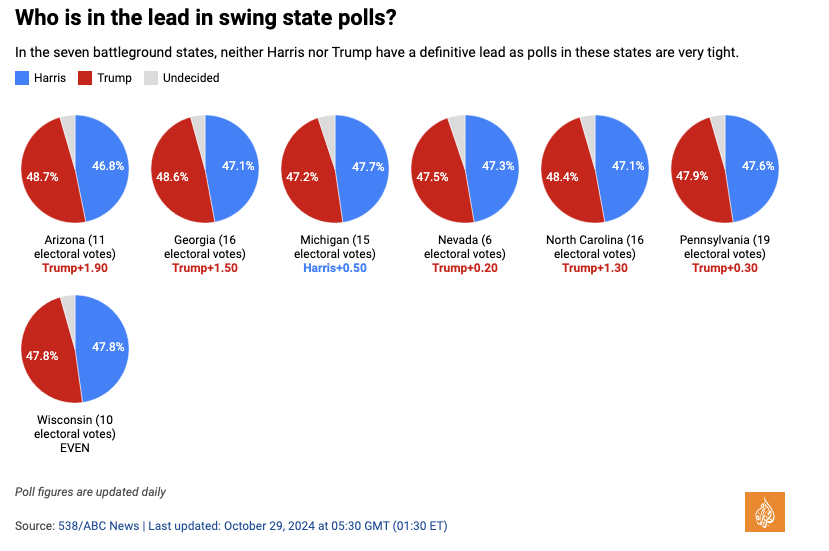 Theo công cụ theo dõi cuộc thăm dò hàng ngày của FiveThirtyEight, Harris vẫn dẫn trước một cách sít sao ở Michigan. Trong khi đó, Trump có lợi thế nhỏ so với Harris ở Pennsylvania và Nevada và có lợi thế đáng kể hơn ở Bắc Carolina, Arizona và Georgia.