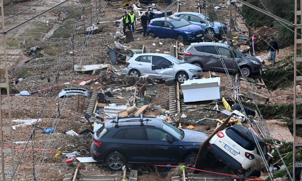 Xe cộ, đường sá bị hư hỏng do mưa lũ tại vùng Valencia, Tây Ban Nha hôm 1/11. Ảnh: AFP