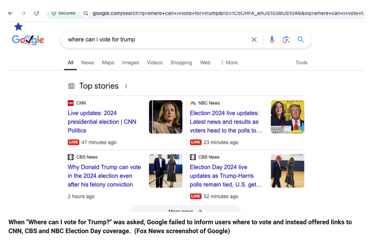 Tuy nhiên, khi nhập "Tôi có thể bỏ phiếu cho ông Trump ở đâu?", Google không thông báo cho người dùng về nơi bỏ phiếu và thay vào đó cung cấp liên kết đến phạm vi đưa tin về Ngày bầu cử của CNN, CBS và NBC.