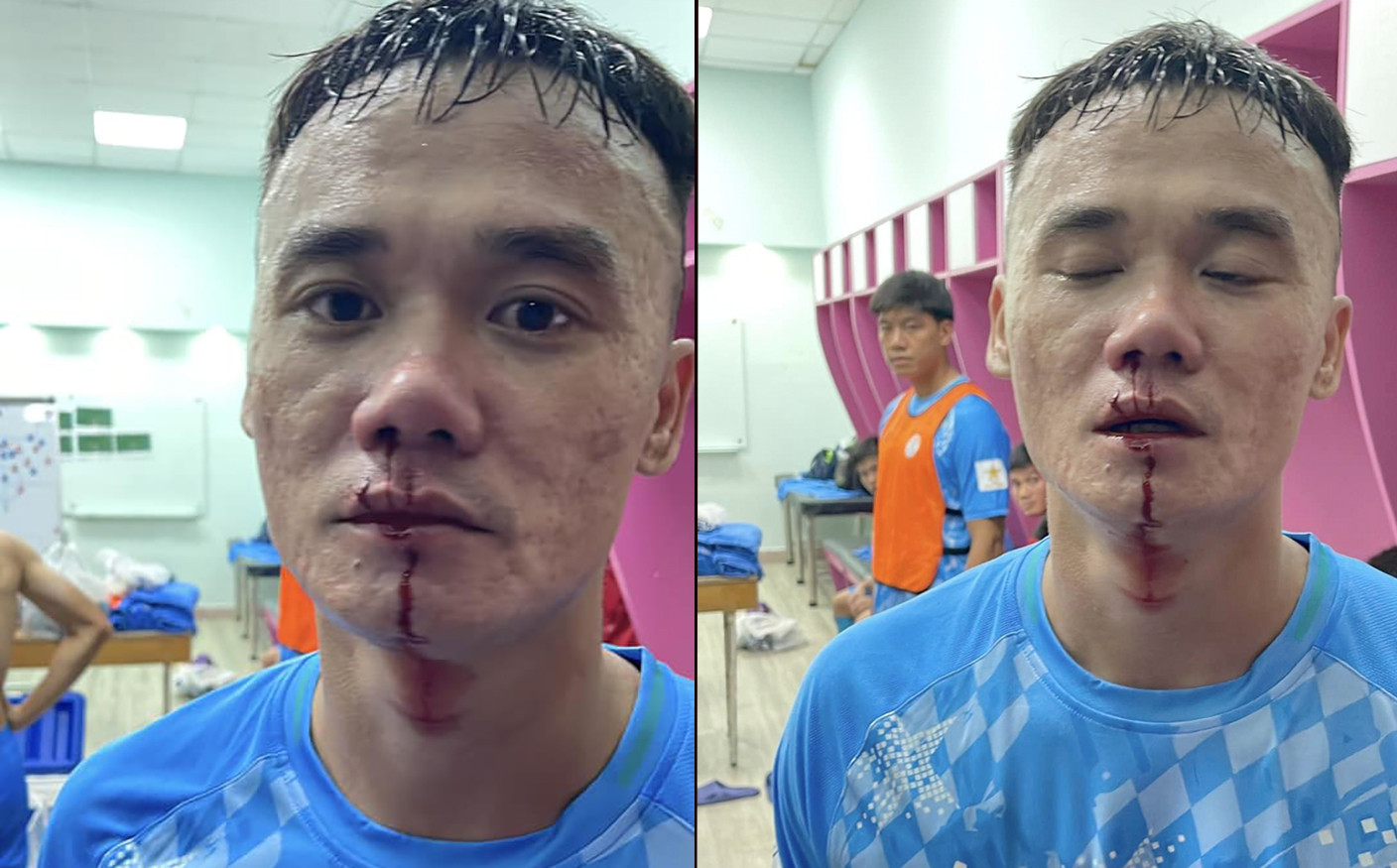 Cầu thủ Xuân Nam bị đối phương đấm vào mặt.