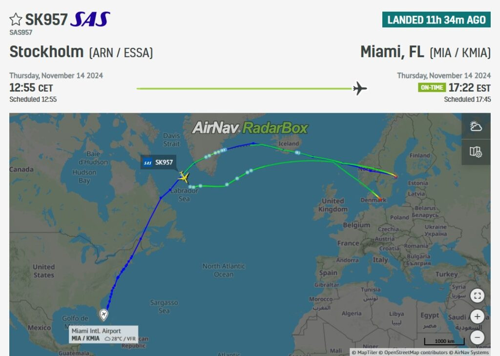 Theo Aviation Source news, chuyến bay mang hiệu SK957 của SAS khởi hành từ sân bay Stockholm Arlanda (Thụy Điển) đến sân bay quốc tế Miami (Mỹ), đã gặp nhiễu động nghiêm trọng ở độ cao 11.277m khi bay qua Greenland, hôm 14/11.
