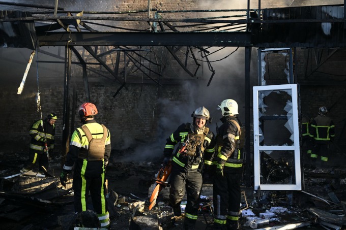 Lực lượng cứu hộ Ukraine dọn dẹp mảnh vỡ tại một tòa nhà bị tập kích UAV ở Kiev ngày 7/11. Ảnh: AFP