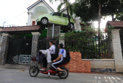 Những ngày gần đây, trên mạng xã hội đã có rất nhiều hình ảnh về chiếc xe ô tô rất đặc biệt. Không phải bởi vì sự hiếm có và đắt tiền của chiếc xe mà do chiếc xe màu xanh lá này được treo trên phần mái cổng của một căn nhà tại Biên Hòa (Đồng Nai). Rất nhiều người không khỏi thắc mắc liệu nguyên nhân nào khiến chủ nhà có quyết định thú vị như vậy.