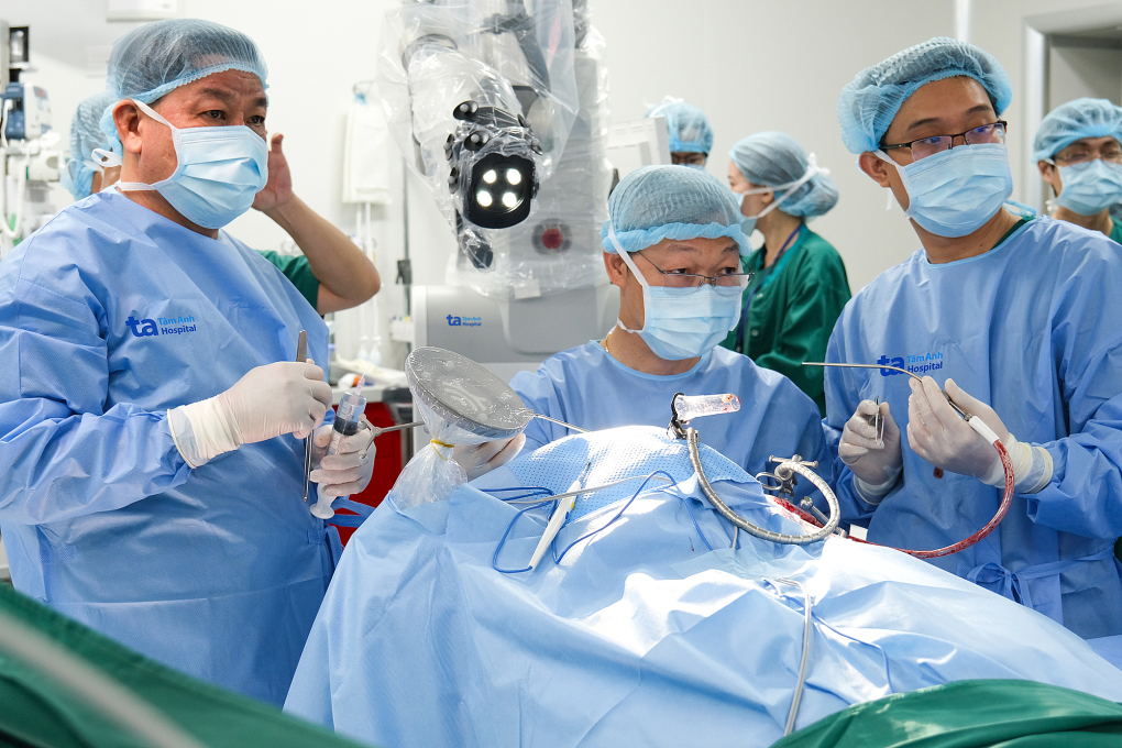 Bác sĩ mổ cấp cứu người bệnh đột quỵ xuất huyết não bằng robot AI. Ảnh: Bệnh viện Đa khoa Tâm Anh