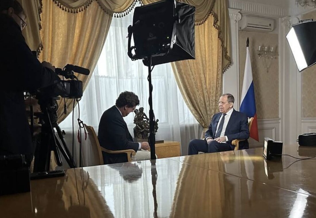 Ngoại trưởng Nga Sergey Lavrov (phải) trả lời phỏng vấn nhà báo Mỹ Tucker Carlson (trái). Nguồn: Telegram/MariaVladimirovnaZak harova