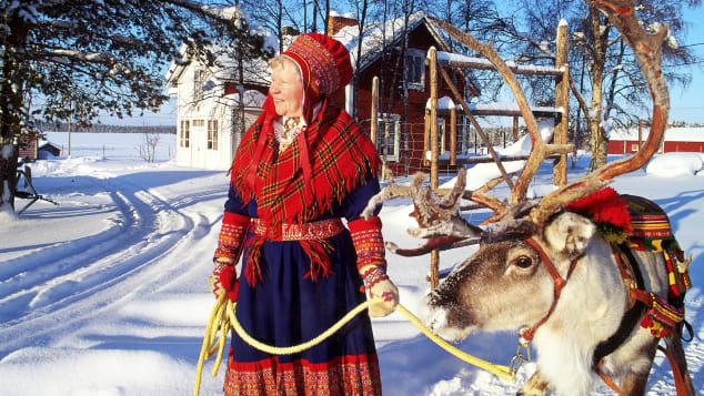 Một người phụ nữ mặc đồ Gákti - trang phục truyền thống của người Sami bản địa- dắt tuần lộc ở Lapland. Ảnh tư liệu: Visit Finland