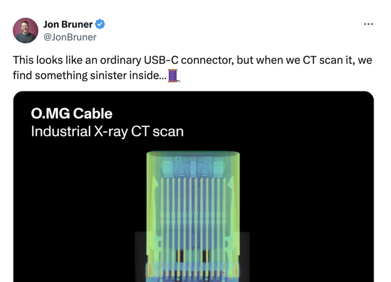 Ảnh chụp CT một chiếc cáp USB độc hại. Ảnh: @jonBruner