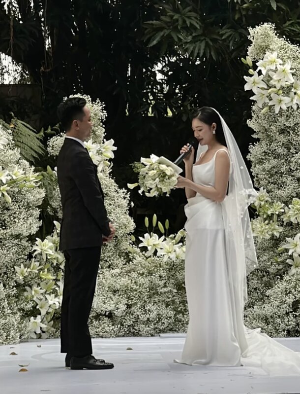 Khi đọc lời thề nguyện dành cho 'nửa kia', nữ tiếp viên xinh đẹp và chồng rưng rưng nước mắt, nghẹn ngào vì xúc động xen lẫn hạnh phúc. Bởi sau khoảnh khắc này, cặp đôi sẽ chính thức về chung một nhà. Sau khi làm lễ ở không gian ngoài trời, Dương Thu Thảo thay sang một chiếc váy khác gọn gàng hơn, đổi kiểu tóc để làm lễ trong nhà.