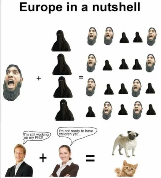Trong vòng 40 năm, với xu hướng nhân khẩu như hiện nay, dân số da trắng châu Âu sẽ suy giảm, trong khi dân số Hồi giáo sẽ gia tăng mạnh mẽ. Charles Gave, một kinh tế gia kiêm bình luận gia chính trị, đã công bố một nghiên cứu của mình trên website của Viện des Libertes, một think tank uy tín ở Pháp. Ông lo lắng về "sự biến mất của các quần thể châu Âu" như dân số bản địa bị thu nhỏ trong khi người Hồi giáo tiếp tục thể hiện một tỷ lệ sanh mạnh mẽ. "Và như vậy, trong vòng 40 năm, gần như chắc chắn rằng dân số Hồi giáo sẽ chiếm đa số ở Áo, Đức, Tây Ban Nha, Ý, Bỉ và Hà Lan," ông viết. "Một lần nữa, đây không phải là dự đoán mà là tính toán, và tôi thậm chí còn không tính tới việc có thêm người nhập cư mới."