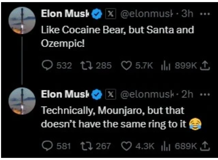 Trên bài đăng, ông cũng so sánh mình với chú gấu uống nhầm cocain có thật tại Mỹ, nhưng trong trường hợp này là ông già Noel và thuốc Ozempic, một loại thuốc giống Mounjaro nhưng liều nhẹ hơn. Ông cũng đánh giá rằng mình thích Mounjaro hơn vì ít tác dụng phụ và hiệu quả cao.