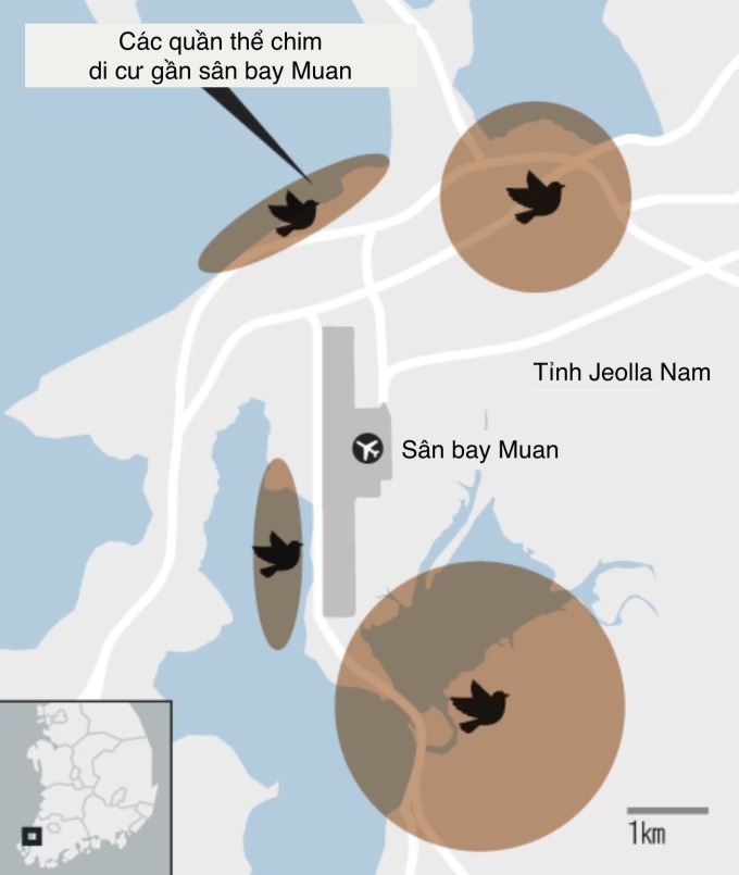 Vị trí các quần thể chim di cư gần sân bay quốc tế Muan. Đồ họa: Chosun