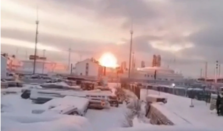 Máy bay không người lái tấn công một cơ sở của Nga gần cảng Ust-Luga ở vùng Leningrad vào ngày 4-1. Ảnh: Supernova