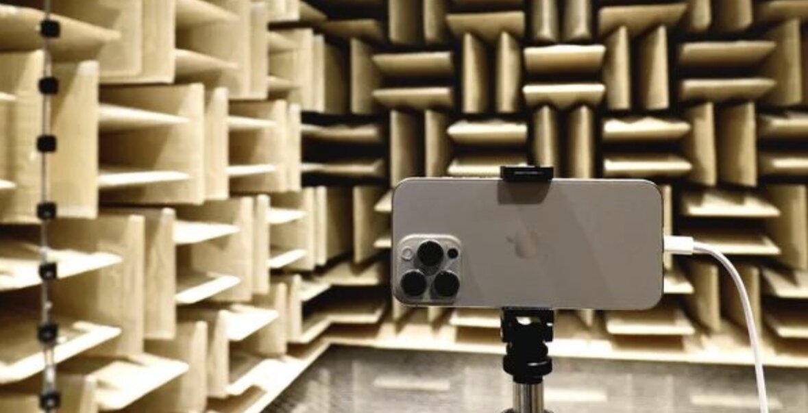 Trong pḥng cách âm, dăy loa hàng chục chiếc được gắn trên một đường ống có h́nh ṿng cung kéo dài từ dưới sàn lưới thép lên đến trần buồng. Các loa phát ra một loạt âm thanh và các kỹ sư đo những ǵ micrô của iPhone 16 Pro thu được.