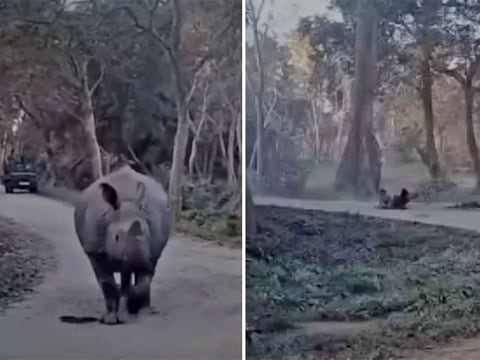 Một chuyến tham quan bằng xe jeep tưởng như bình thường trong Công viên quốc gia Kaziranga (Ấn Độ), nổi tiếng với loài tê giác một sừng, đã biến thành một trải nghiệm kinh hoàng khi hai mẹ con suýt nữa gặp tai họa.