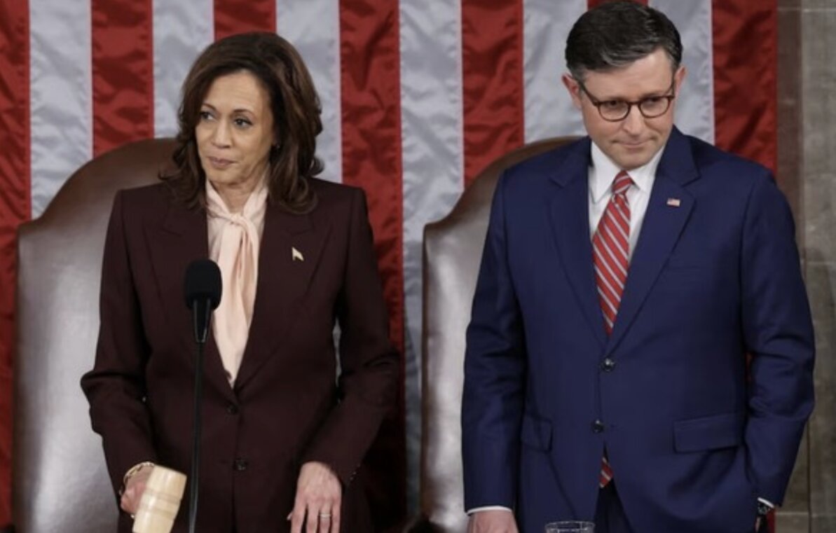 Phó Tổng thống Kamala Harris và Chủ tịch Hạ viện Mike Johnson trong phiên họp chung của Quốc hội Mỹ để chứng nhận kết quả bầu cử tổng thống Mỹ năm 2024. (Ảnh: Reuters)