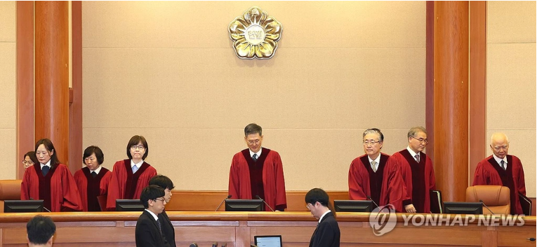 Các thẩm phán Tòa án Hiến pháp tại phòng xử án ở Seoul vào ngày 14/1 (Ảnh: Yonhap).