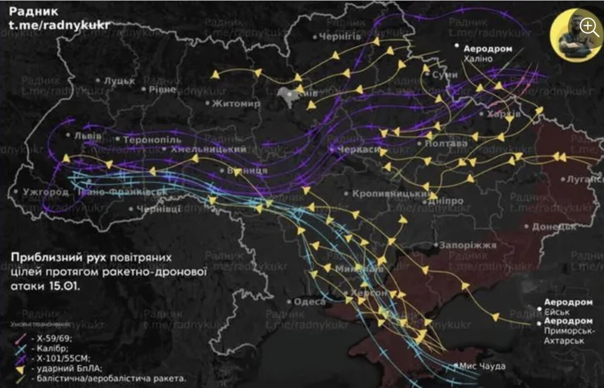 Trong cuộc tập kích sáng ngày 15/1, Nga đã phóng loạt tên lửa tầm xa và máy bay không người lái (UAV) nhằm vào các cơ sở năng lượng ở miền tây Ukranie. Theo thông báo của quân đội Ukraine, Nga sử dụng 40 tên lửa tầm xa với 10 loại khác nhau cùng 70 UAV kiểu Shahed.