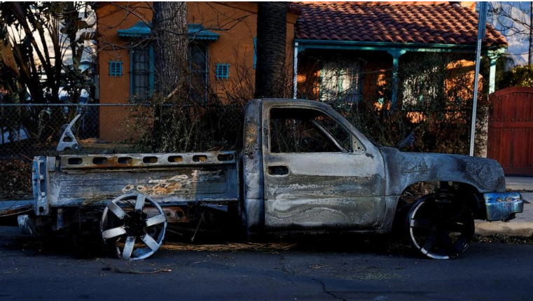 Một chiếc ô tô bị thiêu rụi hoàn toàn trên phố khi đám cháy vẫn tiếp diễn tại Altadena, California, ngày 13/1 (Ảnh: Reuters).