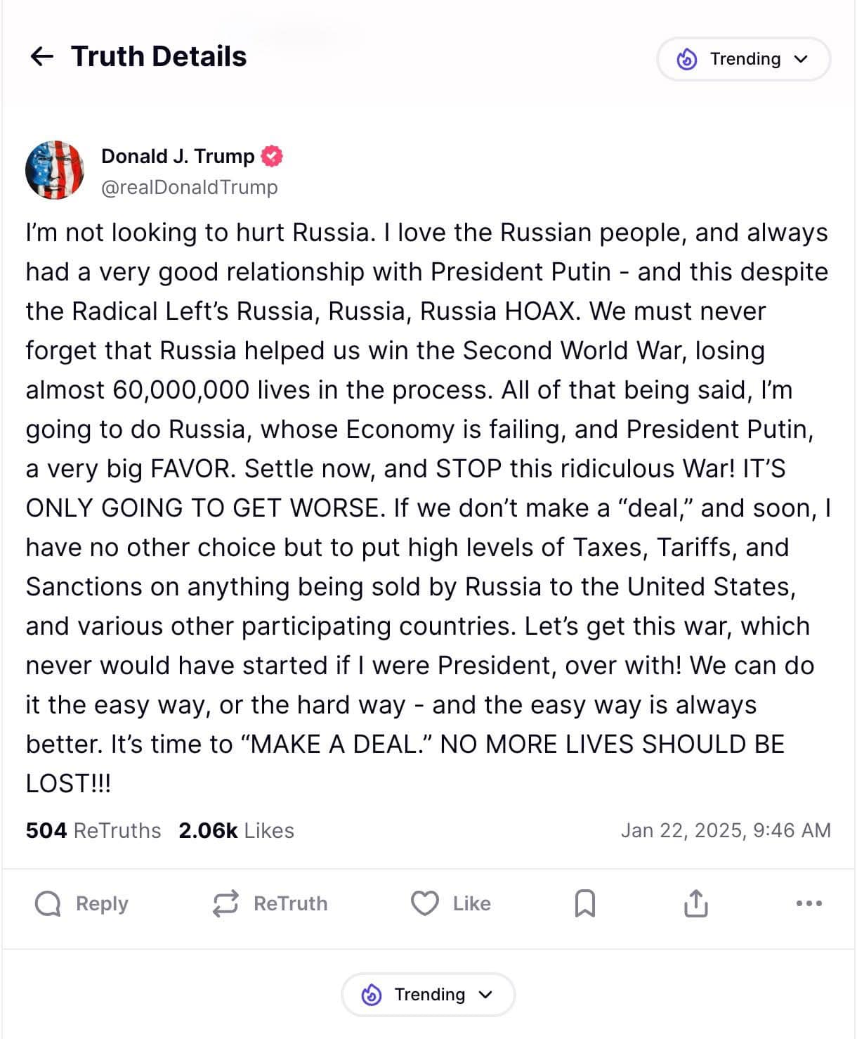 "Tôi không muốn làm tổn thương nước Nga. Tôi yêu người dân Nga và luôn có mối liên quan rất tốt với Tổng thống Putin, và điều này bất chấp những lời nói dối của phe cánh tả cấp tiến về Nga, Nga, Nga. Chúng tôi không bao giờ được quên rằng Nga đã giúp chúng tôi giành chiến thắng trong Thế chiến thứ hai, mất gần 60.000.000 sinh mạng trong cuộc chiến này. Vì những điều đã nói, tôi sẽ giúp nước Nga, một nền kinh tế đang suy thoái, và Tổng thống Putin, một đặc ân rất lớn. Hãy giải quyết ngay bây giờ và dừng cuộc chiến vô lý này lại! Tình trạng sẽ tồi tệ hơn. Nếu chúng ta không sớm đạt được một "thỏa thuận", tôi sẽ không còn lựa chọn nào khác ngoài việc áp dụng mức thuế, thuế quan và lệnh trừng phạt cao đối với bất kỳ thứ gì mà Nga bán cho Hoa Kỳ và nhiều quốc gia tham gia khác. Hãy kết thúc cuộc chiến này, cuộc chiến sẽ không bao giờ bắt đầu nếu tôi là Tổng thống! Chúng ta có thể thực hiện theo cách dễ dàng hoặc theo cách khó khăn, và cách dễ dàng luôn tốt hơn. Đã đến lúc THỎA THUẬN. KHÔNG NÊN MẤT THÊM SINH MẠNG!!!