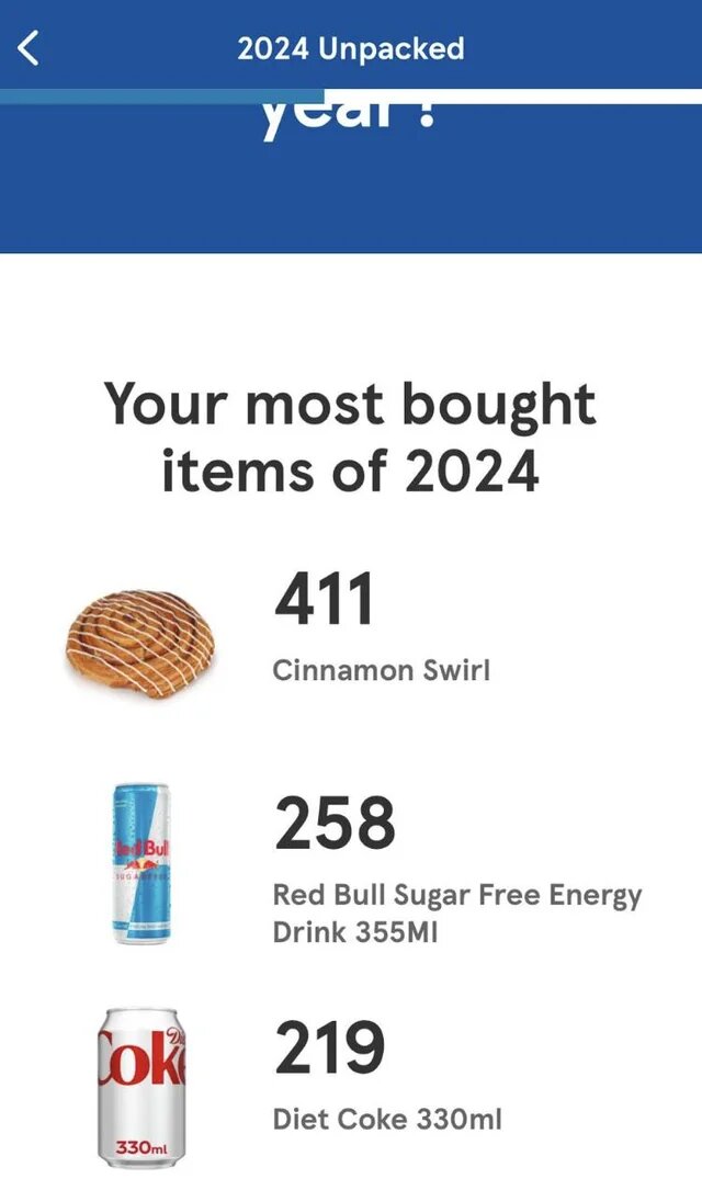 Theo danh sách những món đồ đã mua, ba mặt hàng dẫn đầu là 411 chiếc bánh cuộn quế, 258 lon Red Bull không đường và 219 lon Coke dành cho người ăn kiêng. Anh than thở: "Tesco đã bán đứng tôi cho ứng dụng Clubcard của vợ tôi."