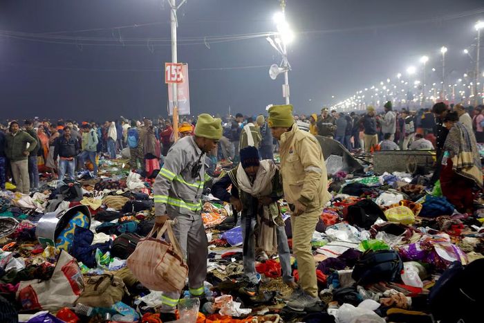 Quần áo, đồ đạc và cả thi thể người nằm ngổn ngang sau vụ hỗn loạn tại lễ hội Maha Kumbh Mela ngày 29/1/2025. Ảnh: Reteurs.