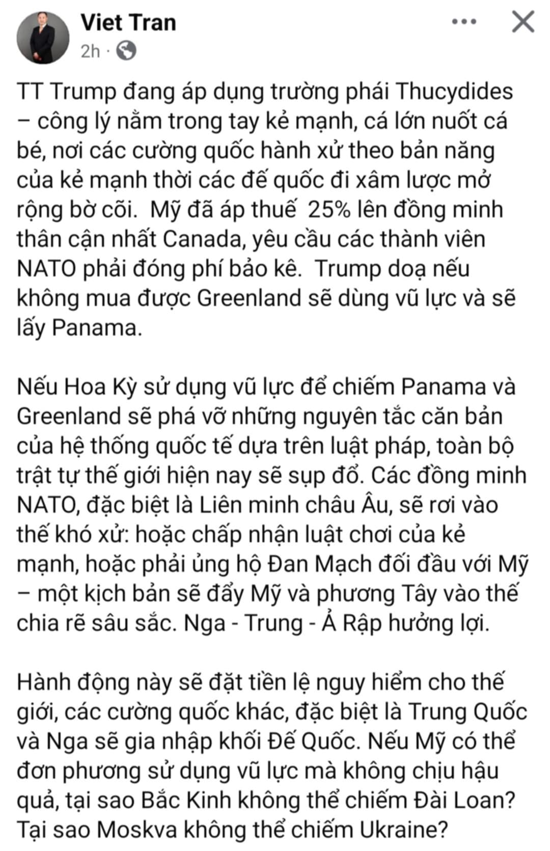 Vấn đề tổng thống Trump đánh thuế nhập khẩu Canada , Mexico 25%, và Trung Quốc 10%, không phải cá lớn nuốt cá bé theo trường phái Thucydides như luận điệu của thằng ku thiên tả trong h́nh ở dưới lư sự. Tui cũng dám khẳng định, rằng : KHÔNG BAO GIỜ CÓ CHIẾN TRANH THẾ GIỚI THỨ 3.