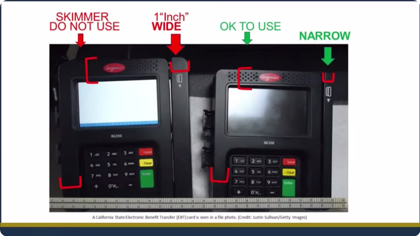Người thụ hưởng phúc lợi qua thẻ EBT có thể tìm hiểu cách phát giác các vụ lừa đảo EBT, máy quét thẻ nhà băng và máy quay giấu trong ATM tại đây: