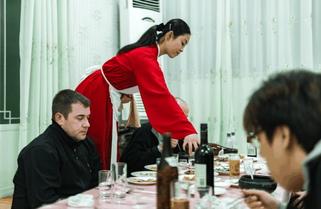 Một người Triều Tiên phục vụ bia cho khách du lịch nước ngoài tại khách sạn Kaesong Folk. Nguồn: Shutterstock.