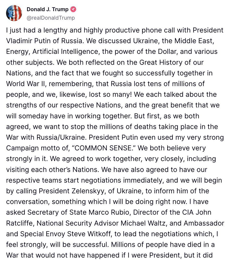 Bài đăng trên mạng xã hội Truth Social của Tổng thống Mỹ Donald Trump nói về cuộc điện đàm với Tổng thống Liên bang Nga Vladimir Putin. Ảnh chụp màn hình tài khoản mạng xã hội Truth Social của Tổng thống Mỹ Donald Trump