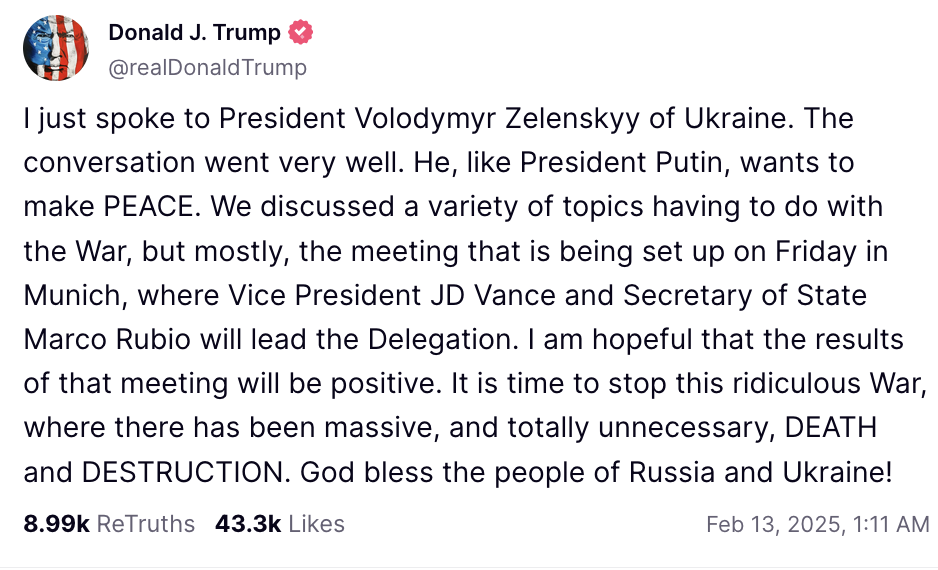 Trong bài đăng trên Truth Social, Tổng thống Mỹ cho biết cuộc điện đàm với người đồng cấp phía Ukraine diễn ra rất tốt. Phó Tổng thống Mỹ JD Vance và Ngoại trưởng Marco Rubio sẽ gặp Tổng thống Ukraine Volodymy Zelensky vào ngày 14/2 tại Munich.