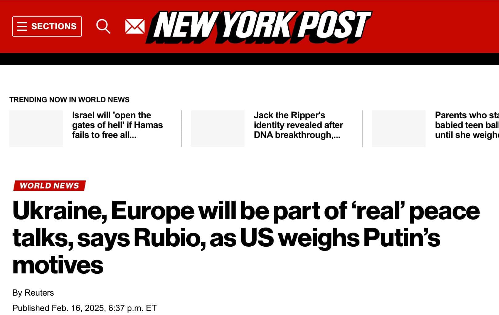 Ngoại trưởng Hoa Kỳ Marco Rubio hôm Chủ Nhật cho biết Ukraine và châu Âu sẽ là một phần của bất kỳ "cuộc đàm phán thực sự" nào, cho việc thoả thuận ngưng bắn thực sự giữa Ukraine và Nga. Câu tuyên bố này như muốn ám chỉ rằng các cuộc đàm phán của Hoa Kỳ với Nga trong tuần này chỉ là cơ hội để Mỹ xem thử Tổng thống Nga Vladimir Putin nghiêm túc như thế nào về vấn đề các phương pháp ḥa b́nh mà Mỹ đă đưa ra