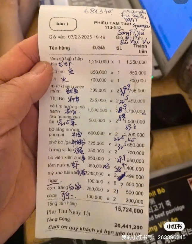 Cụ thể như 1 đĩa rau muống xào tỏi 500.000 đồng, 1 phần cà tím nướng mỡ hành 1.890.000 đồng, 1 tô phở bò/gà 325.000 đồng, 1 trứng vịt lộn 325.000 đồng, 1 phần cơm trắng 250.000 đồng, 1 lon bia Tiger/Coca 100.000 đồng. Cộng các món nhóm du khách đã ăn thể hiện trên phiếu tạm tính 15.724.000 đồng, nhà hàng tính thêm “phụ thu ngày Tết” 4.717.200 đồng, nên tổng số tiền phải trả 20.441.200 đồng.