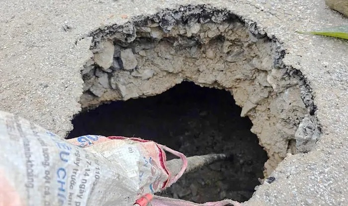 Hố sụt lún sâu 2m, rộng 4m xuất hiện ở tuyến đường huyện lộ.
