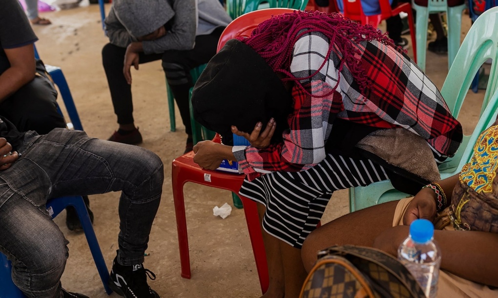Những người được cho là nạn nhân của các trung tâm lừa đảo chờ ở biên giới Myanmar để vào Thái Lan hôm 12/2. Ảnh: AFP