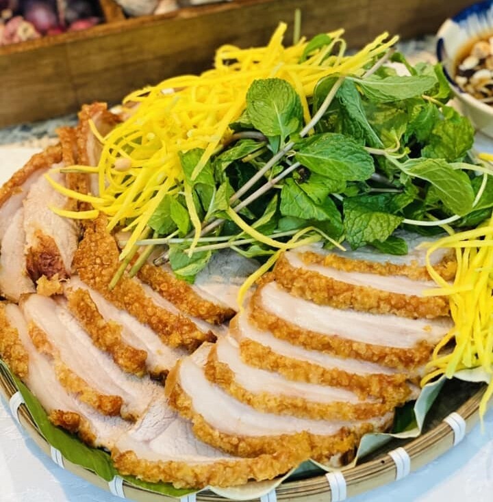 Món thịt heo quay thơm nức, phần thịt mềm ngọt, phần bì giòn tan ăn kèm xoài chua và chấm nước sốt chua ngọt cực ngon.