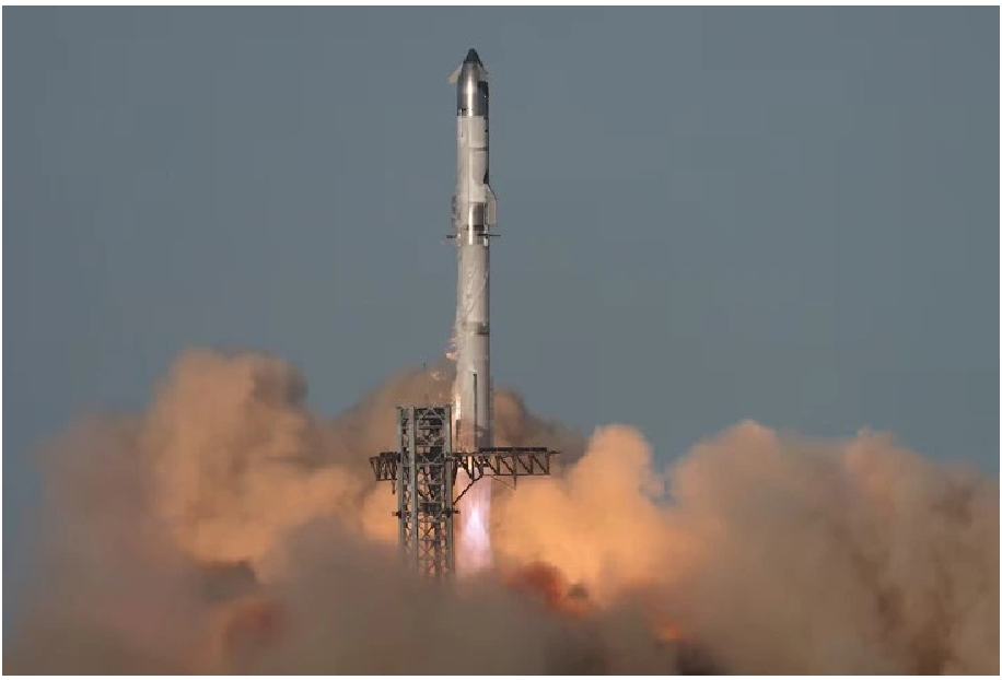 Bộ đẩy Super Heavy quay trở lại bệ phóng sau khi tàu vũ trụ Starship của SpaceX tiếp tục bay thử lần thứ tám tại Boca Chica, bang Texas, Mỹ ngày 6/3. Ảnh: Reuters