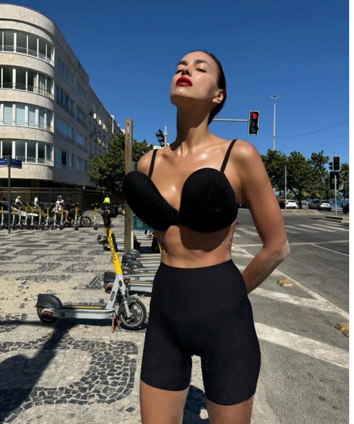 Thiết kế mang tinh thần siêu thực, thách thức trọng lực, phóng đại vòng một của người mặc. Mẫu áo lót phù hợp với nhiều phong cách. Tại bãi biển, trên đường phố, Irina Shayk kết hợp áo ngực “núi đôi” với quần short biker, thể hiện sự cá tính, năng động. Cô chọn màu son đỏ đậm và kiểu tóc ướt nước, vuốt ngược cho tạo hình này. Ảnh: @IrinaSHayk.