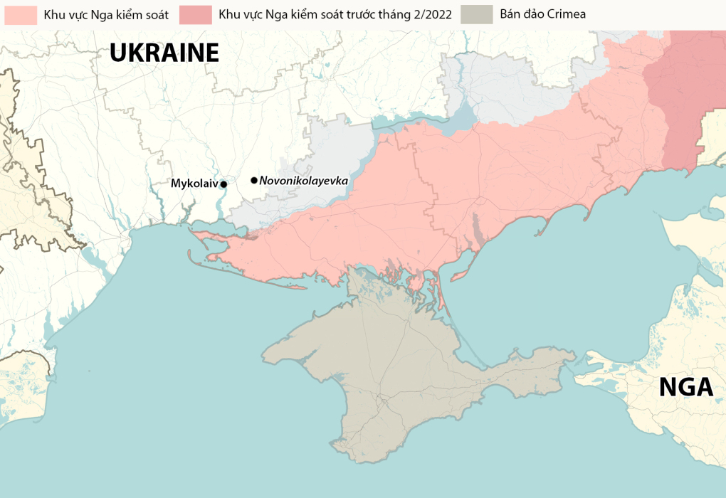 Vị trí làng Novonikolayevka ở tỉnh Mykolaiv, Ukraine. Đồ họa: RYV