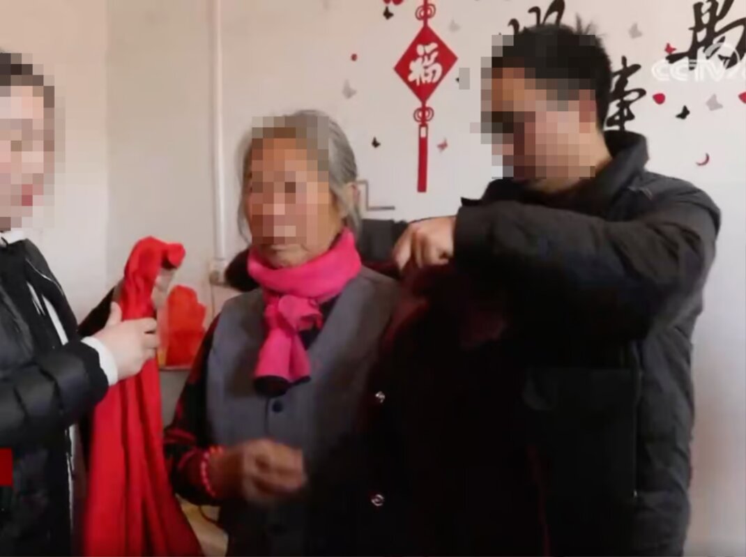 Zhang giúp người mẹ thất lạc từ lâu của mình mặc áo khoác sau cuộc đoàn tụ đầy cảm xúc.