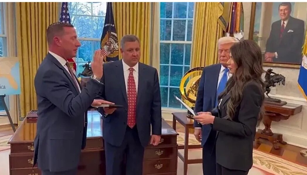Đích thân Bộ trưởng An ninh nội địa Mỹ Kristi Noem tiến hành nghi lễ nhậm chức cho đặc vụ Sean Curran ngay tại Phòng Bầu dục của Nhà Trắng.
