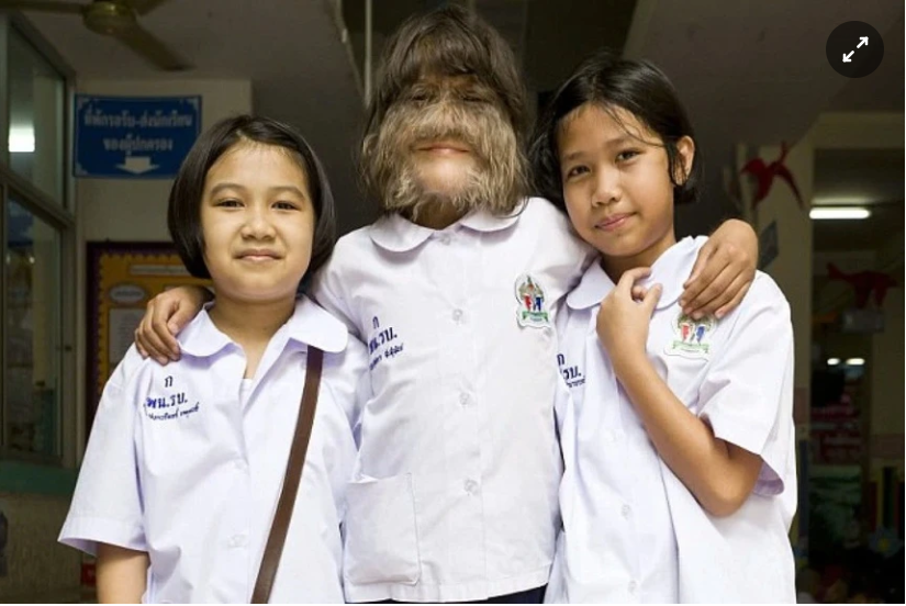 Ngày 5/8/1999, Supatra Sasuphan (tên thường gọi là Nat) chào đời trong niềm vui và cả sự kinh hãi của bố mẹ khi có bộ lông dài bao phủ gần như toàn bộ cơ thể. Sasuphan mắc "hội chứng người sói", khiến lông trên cơ thế phát triển quá mức, trừ lòng bàn tay, lòng bàn chân và niêm mạc. Tình trạng của cô khi đó cũng khiến các bác sĩ Thái Lan bối rối bởi trên thế giới mới chỉ ghi nhận 50 trường hợp tương tự. Ảnh: CGTN.